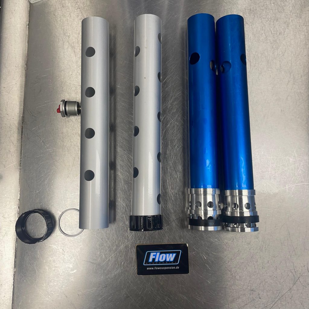 Wir empfehlen in der Gabel unsere FLOW Spring Tubes; andere Federhalter, die den Ölfluss beim Einfedern der Gabel ändert und damit das Verhalten der Gabel bei schnellen, großen Hüben verbessert.