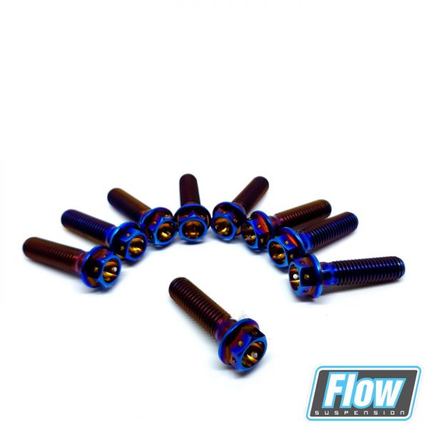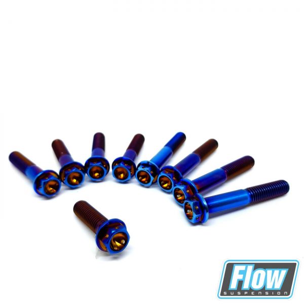 Unser Gabelbrücken Kit besteht aus 9 Race Spec Titanschrauben in der Farbe „burnt blue“.